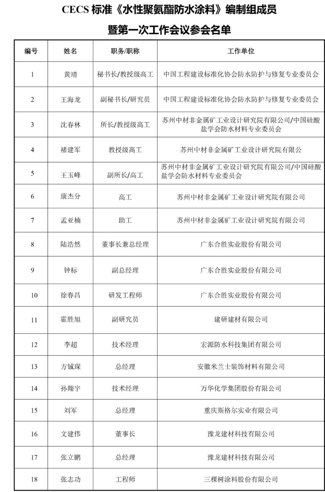《水性聚氨酯防水涂料》标准由苏州中材非金属矿工业设计研究院有限公司、广东合胜实业股份有限公司主编。主编单位及编制组成员名单如下表。