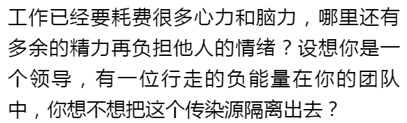 处在一个岗位上,就是处在一个团队中,情绪的表露不再私人化,它会影响到整个团队。谁会喜欢一个浑身散发负能量的人呢?